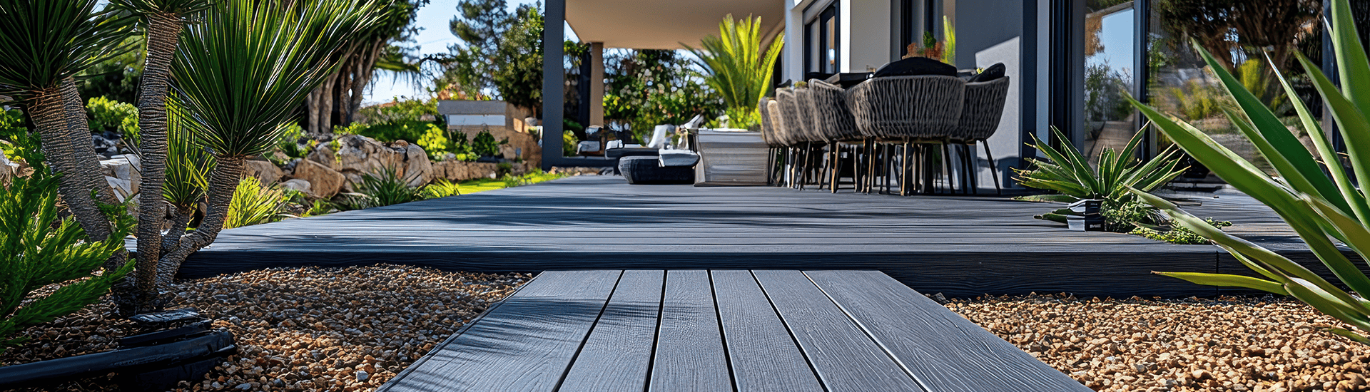Professzionálisan kivitelezett prémium WPC terasz modern környezetben.